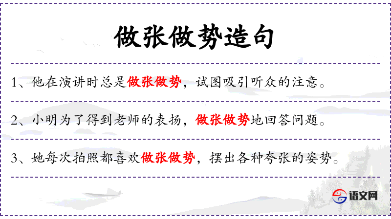 - 做张做势:成语,形容故意装模作样,夸张表现。