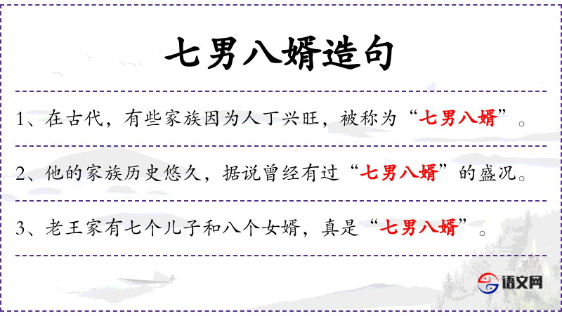 - 成语“七男八婿”:形容家庭成员众多,特别是男性成员。