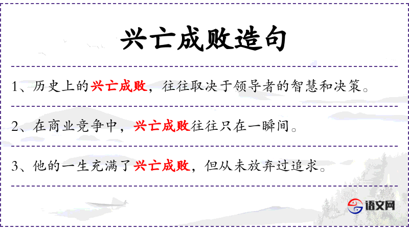 - 兴亡成败:名词短语,指国家或个人的兴盛、衰亡、成功、失败。