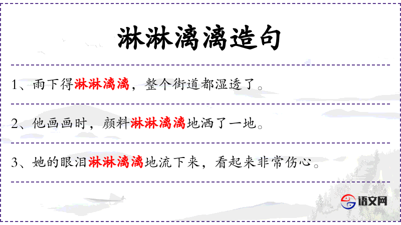 2. 【淋淋漓漓】 - 液体湿湿地淌下,指流滴的样子。