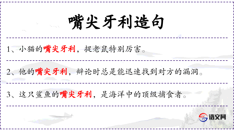 - 谓语:无明确谓语,因为“嘴尖牙利”是一个名词短语