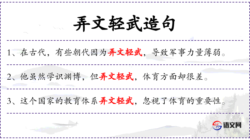- 弄文轻武:指重视文科而轻视武科或体育。