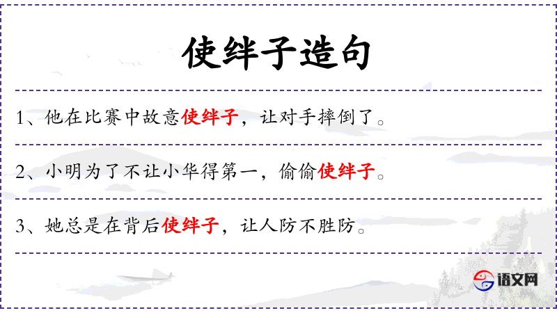 - 使绊子:动词短语,指采取不正当手段阻碍他人。