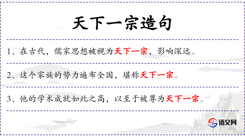 - 天下一宗:成语,形容在某一领域内被公认为最高权威或代表。