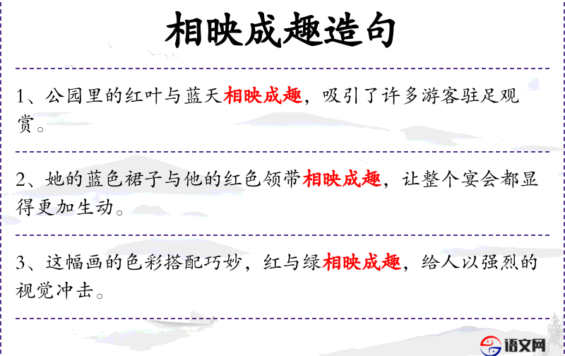 5. 【相映成趣】 映:对照,映衬。相互衬托着,显得很有趣味,很有意思。