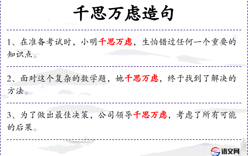 - “千思万虑”这个成语体现了中文表达中对情感和心理状态的细腻描绘。