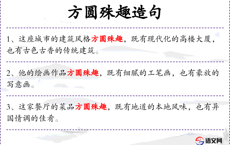 - 修饰语:“方圆殊趣”(形容词短语,修饰主语)