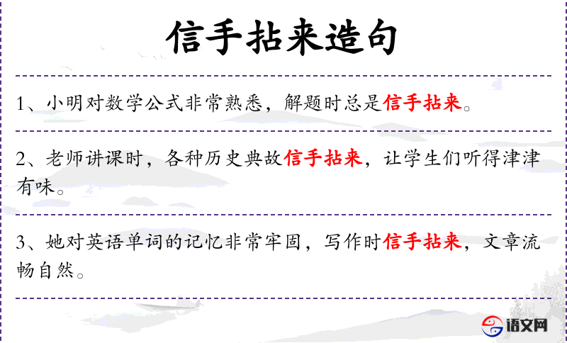 2. 【信手拈来】 信手:随手;拈:用手指捏取东西。随手拿来。多指写文章时能自由纯熟的选用词语或应用典故,用不着怎么思考。
