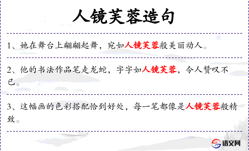 - 人镜芙蓉:比喻美丽的女子,源自“人面桃花相映红”的意境。