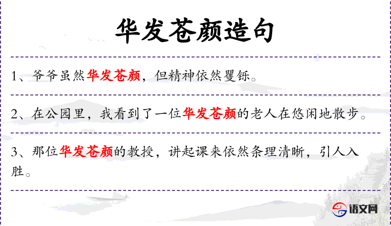 - 华发苍颜:形容词短语,意指年老,头发花白,面容苍老。