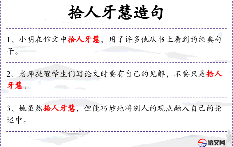 - 拾人牙慧:比喻借鉴别人的言论或观点,但不一定完全照搬。