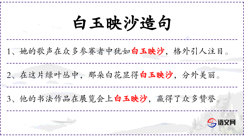 3. 【白玉映沙】 - 像白玉的光映照在沙土上。比喻诗文出类拔萃。