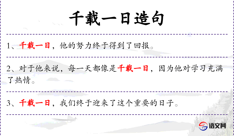 - 状语:“千载一日”,用作时间状语,比喻时间很长,强调努力的持久性和不易。