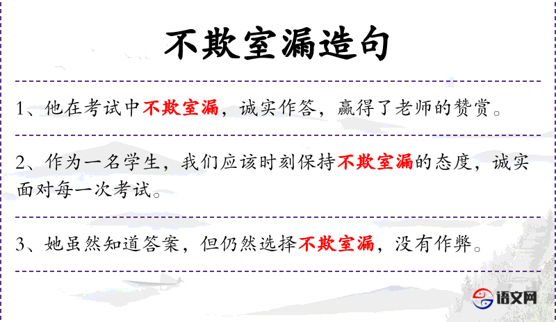句子中的“不欺室漏”是一个成语,源自古代科举考试,意指在考试中不作弊,诚实面对。这反映了传统文化中对诚信的重视。