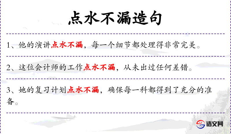 4. 【点水不漏】 - 形容十分周到、严密,毫无差失漏洞。