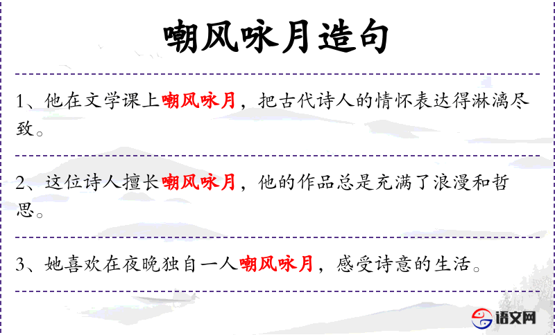 句子在文学评论或介绍诗人的文章中较为常见,用于描述诗人的创作风格和作品特点。在不同的文化背景下,“嘲风咏月”可能会有不同的解读,但总体上都是指对自然美景的赞美和抒发情感。