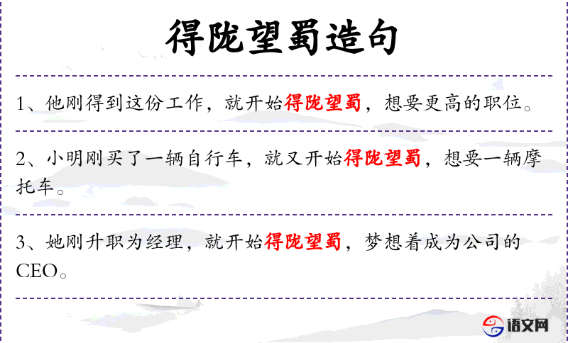 得陇望蜀是一个成语,源自历史典故,比喻贪得无厌。这个成语反映了人对于贪婪和不满足的传统看法。在现代社会,这个成语仍然被广泛使用,用来形容那些不满足于现状,总是追求更多更好的人。