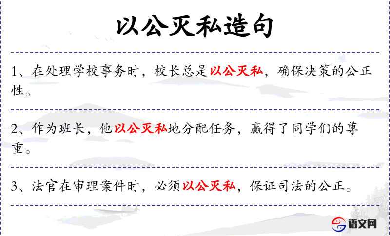 - 以公灭私:指在处理事务时公正无私,不偏袒个人利益。