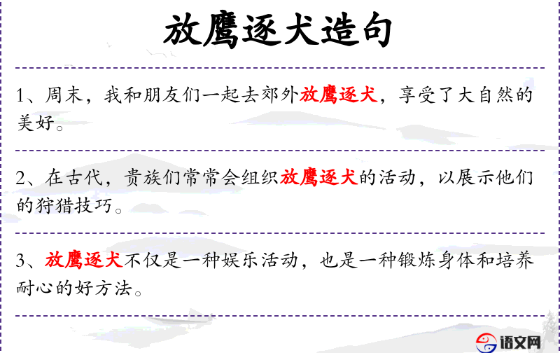 “放鹰逐犬”可能与某些文化中的狩猎传统有关,这种活动在现代可能更多地被视为一种休闲娱乐方式。了解其历史背景和文化意义有助于更全面地理解句子的含义。