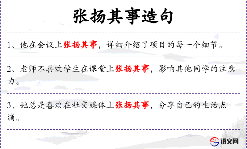 1. 【张扬其事】 张扬:宣扬。把事情加以宣扬。