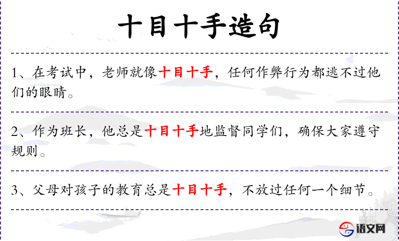 - 十目十手:这是一个成语,意思是形容非常仔细、周到,每个细节都不放过。