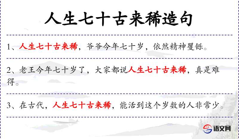 - 人生七十古来稀:这是一个成语,意思是七十岁高龄的人自古以来就很少见。