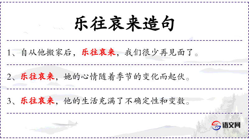 - 乐往哀来:这个成语意味着情绪或境遇的起伏变化,从快乐到悲伤,或从悲伤到快乐。