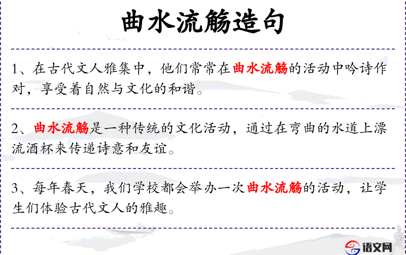 1. 【曲水流觞】 古民俗,每年农历三月在弯曲的水流旁设酒杯,流到谁面前,谁就取下来喝,可以除去不吉利。