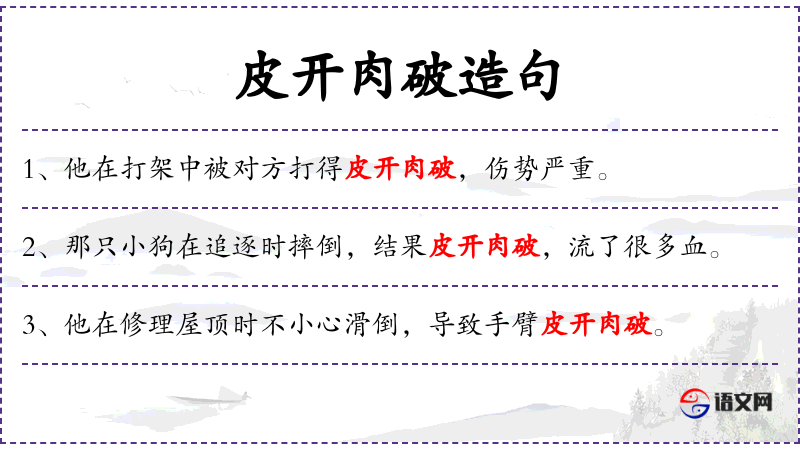 1. 【皮开肉破】 - 皮肉都裂开了。形容被打伤势严重。