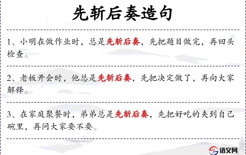 - 句子在描述小红的绘画*惯时,使用了“先斩后奏”这个成语,增加了句子的文化深度。