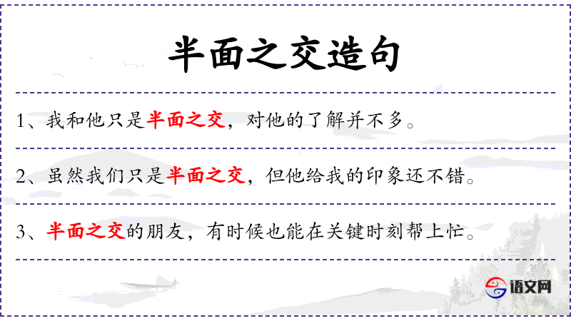 文化意义:“半面之交”体现了文化中对人际关系的细腻描述,强调了交往的深度和广度。 相关成语**:“一面之缘”(指只有一次见面的缘分)。