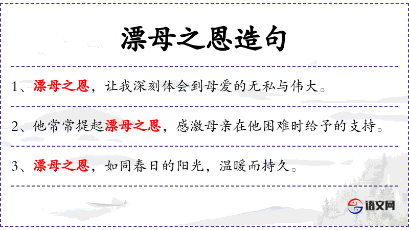1. 【漂母之恩】 - 漂母:在水边漂洗衣服的老妇。指馈食于人的恩惠。