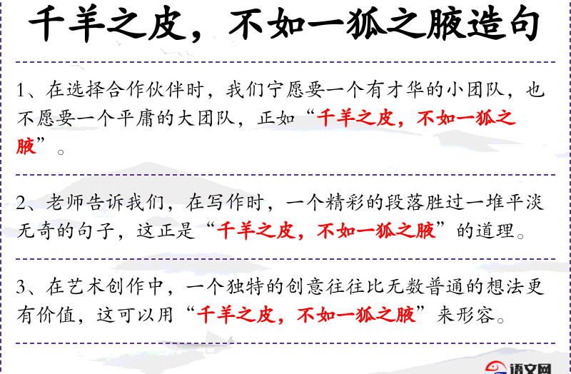 - 可以改写为:“在构建团队时,一位具备领导才能的关键成员的价值远超一群缺乏方向的普通成员,这正是‘千羊之皮,不如一狐之腋’所要传达的深刻道理。”