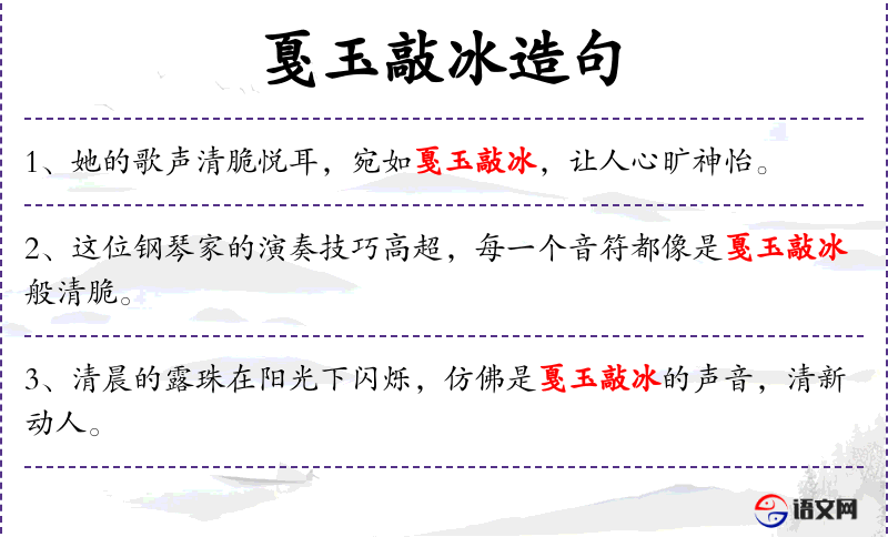 1. 【戛玉敲冰】 戛:敲击。敲打玉器和冰块。形容声调有节奏而响亮好听。也形容人气节凛然。