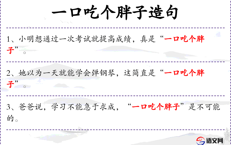 1. 【一口吃个胖子】 - 吃一口饭长成一个胖子。比喻急于求成。