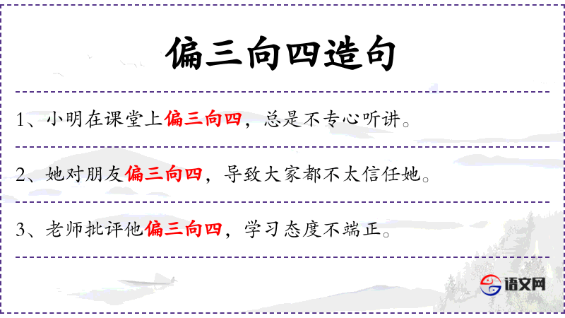- 偏三向四:这个短语可能是一个成语或俗语,具体含义不明确,但从上下文推测,可能是指行为不一致或不专注。