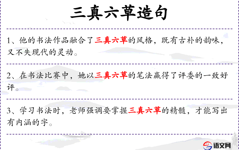 1. 【三真六草】 - 真:正楷;草:草体。泛指各种书体。