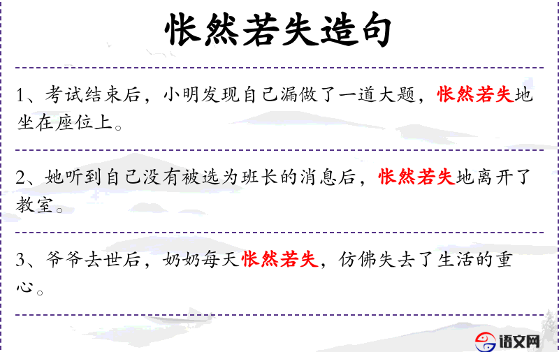 - 怅然若失:形容词短语,表示心情的失落。 *. 四处:副词,表示动作的范围。