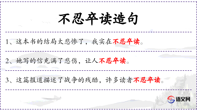 1. 【不忍卒读】 - 卒:尽,完。不忍心读完。常用以形容文章内容悲惨动人。
