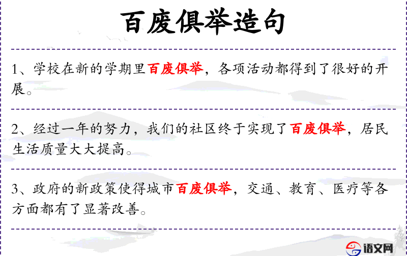 1. 【百废俱举】 - 指一切废置的事都兴办起来。同“百废俱兴”。