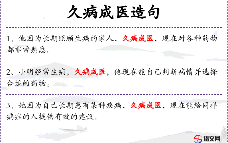 - 久病成医:长期患病后对疾病有了深入了解,成语,意为长期患病后对疾病有了深入了解。