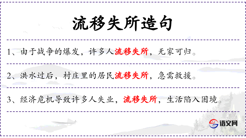 4. 【流移失所】 - 犹言流离失所。指无处安身,到处流浪。