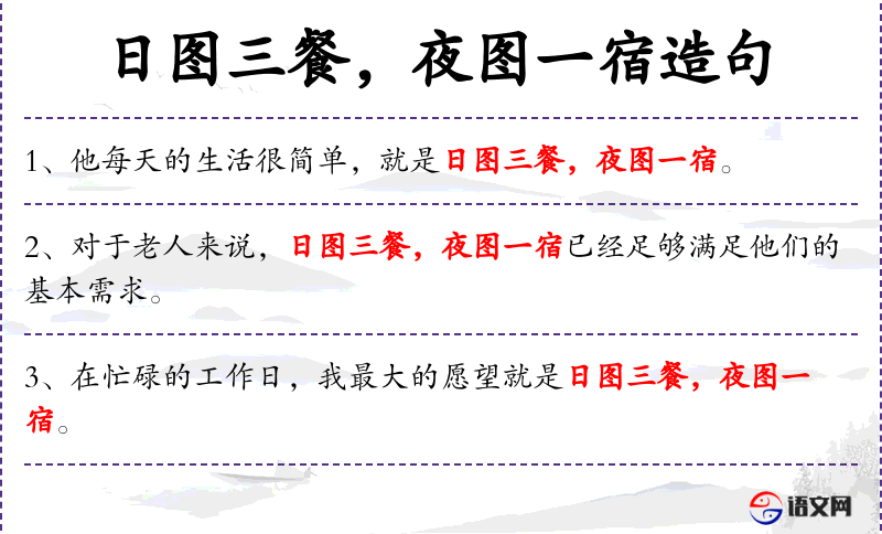 - 宾语:日图三餐,夜图一宿,享受简单而宁静的日子