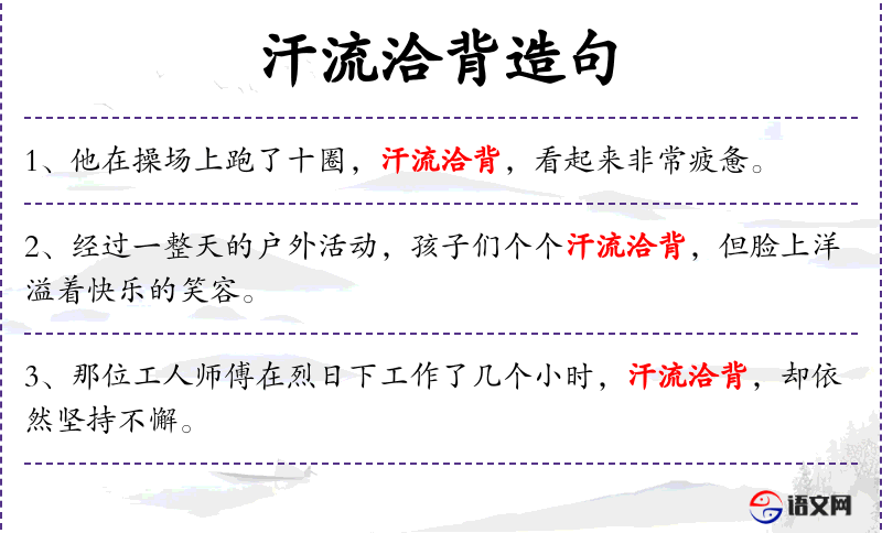 6. 【汗流洽背】 - 汗流得满背都是。形容非常恐惧或非常害怕。现也形容出汗很多,背上的衣服都湿透了。同“汗流浃背”。