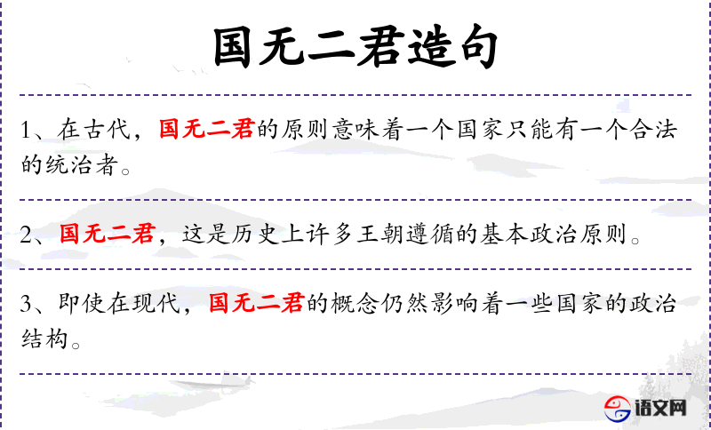 - 国无二君:指一个国家只能有一个君主,不能有两个并立的君主。
