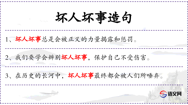 - 坏人坏事:名词短语,指不道德或违法的人和行为。