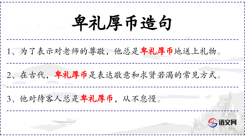 - 文化意义:卑礼厚币在**文化中常用来形容对上级的尊重和期望得到帮助的诚意。