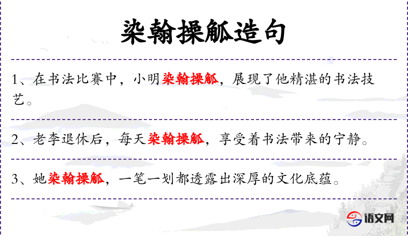 1. 【染翰操觚】 - 翰:毛笔;操觚:拿木简写文章。指提笔作文。