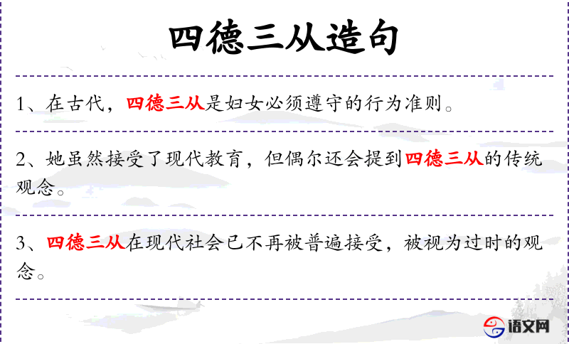 - 四德三从:**传统文化中的概念,四德指妇德、妇言、妇容、妇功,三从指妇女未嫁从父、既嫁从夫、夫死从子。
