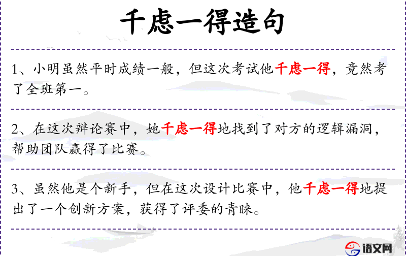 - 成语:千虑一得,源自《左传·宣公十五年》,原意是指多次思考后得到一个好主意,这里用来形容小明通过努力取得了好成绩。